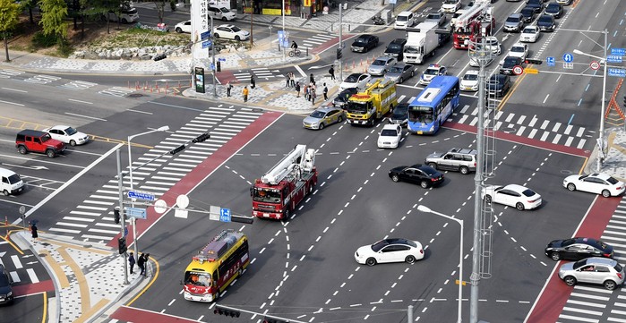 | ▲ 대전소방본부가 21일 둔산동 경성큰마을 사거리에서 ‘소방차 길 터주기 훈련’을 실시하고 있다. |
