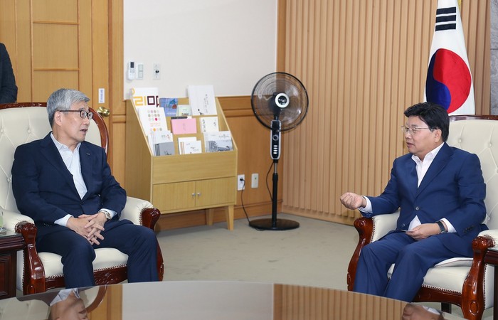 | ▲ 권선택 대전시장(오른쪽)과 송영덕 롯데그룹 부회장이 27일 대전시청 시장실에서 회동을 갖고 유성복합터미널 사업협약 해지에 대한 서로의 입장을 밝히고 있다. |