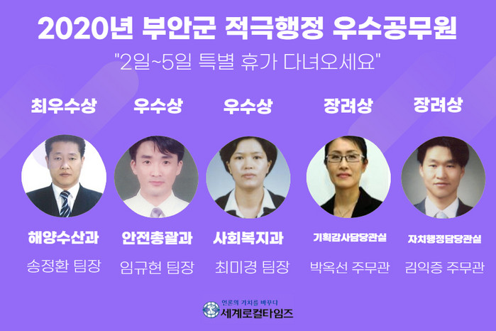 [세계로컬타임즈 조주연 기자] 전북 부안군 적극행정 우수공무원 5명이 2~5일의 특별휴가를 받는다.