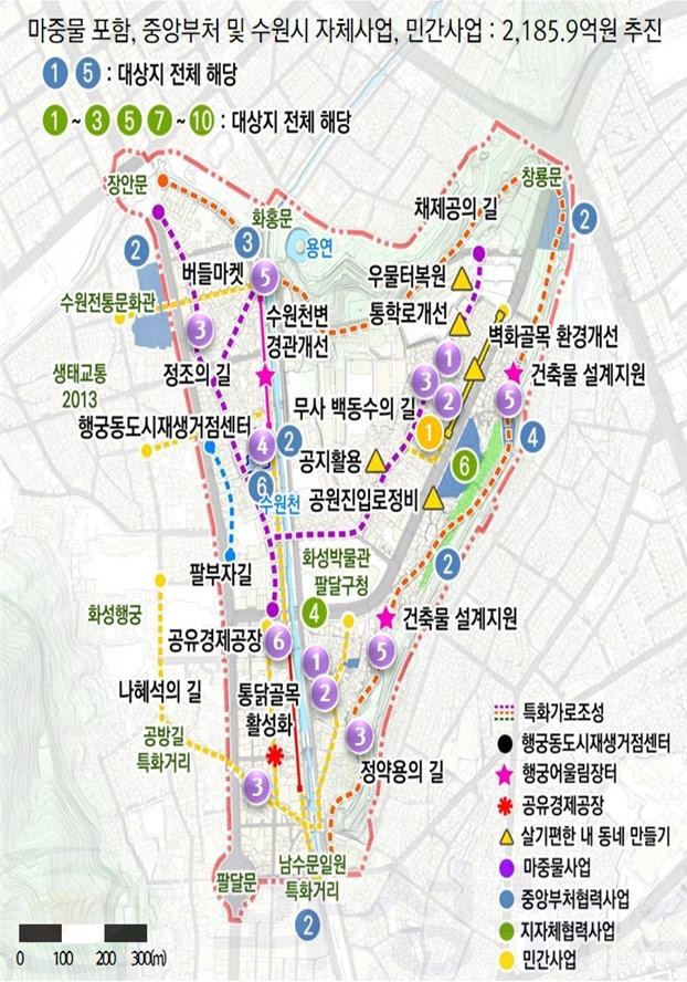 이번 승인으로 수원시 행궁동지역에는 2020년까지 5개년에 걸쳐 국비 50억원을 포함한 100억원 규모의 공모사업과 정부부처와의 협업사업 1604억원, 수원시 자체 사업 416억원, 민간사업 65억원 등 총 2185억원의 예산이 지원될 예정이다.