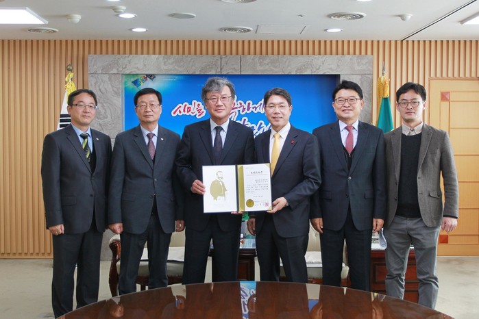 | ▲ 이재관 대전시장 권한대행(왼쪽 네번째)와 정상철(왼쪽 세번째)회장과 함께 특별회원증을 들고 기념촬영하고 있다. |