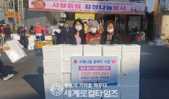 [세계로컬타임즈 조주연 기자] 전북 김제중앙초등학교 총동창회가 김제경찰서 의경 및 지역업체와 함께 '김장김치 나눔 행사'를 펼쳤다.