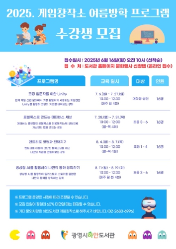 운영 기간은 7월 6일부터 8월 19일까지이며, 주요 프로그램은 ▲코딩 입문자를 위한 유니티(Unity) ▲로블록스로 만드는 메타버스 세상 ▲엔트리로 코딩과 친해지기 ▲생성형 AI를 활용한 나만의 동화 창작하기 등 총 4개다.