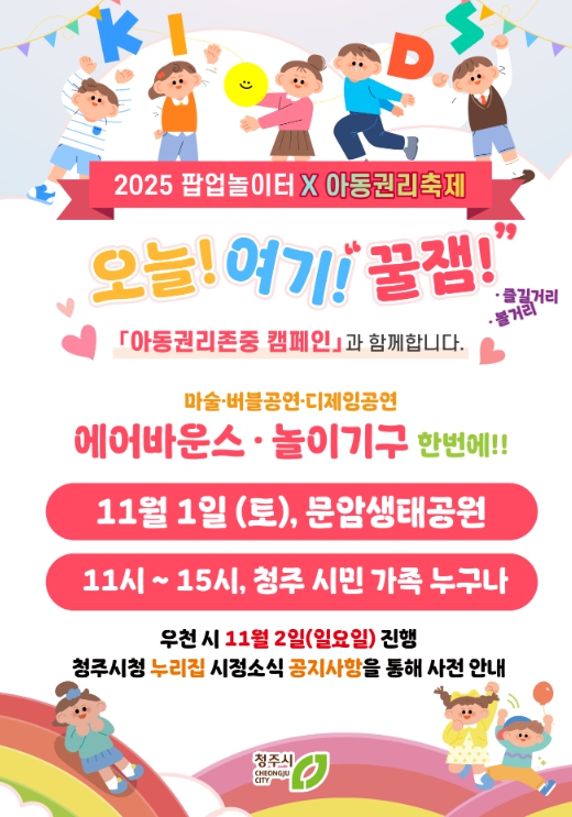 시 관계자는 “올 한 해 8회에 걸쳐 운영된 팝업놀이터가 시민들의 큰 호응 속에 마무리되고 있다”며 “내년에도 아이들이 더 즐겁고 안전하게 놀 수 있도록 팝업놀이터를 이어가고, 아동권리가 존중받는 도시, 청주를 만들어가겠다”고 말했다.