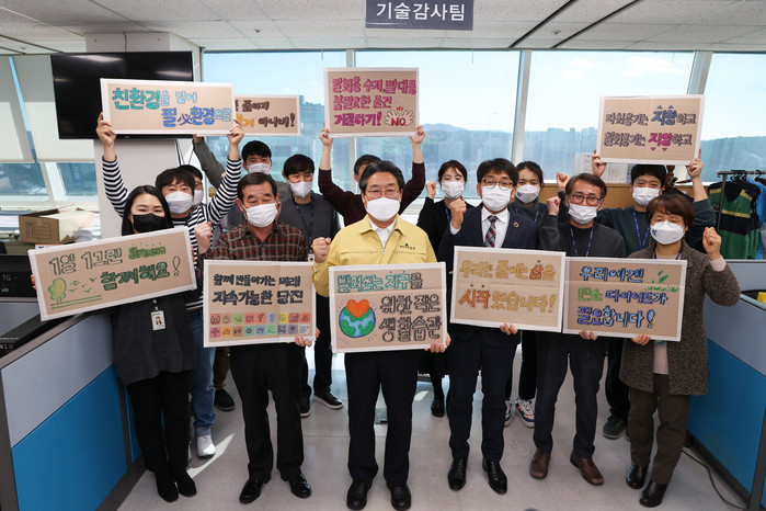 우선 청사 내 일회용품 반입 금지와 청사 주변 배달음식점의 다회용기 사용 권장 등 공직자와 시민이 함께 실천하는 분위기 조성에 적극 나섰으며 ▲일회용품 없는 회의 ▲종이 없는 위촉식(위촉장 전자메일로 전달하기) ▲생활 속 나만의 텀블러 생활화 등 부서별 실천과제를 정해 탄소 중립 실현을 위한 노력을 기울였다.