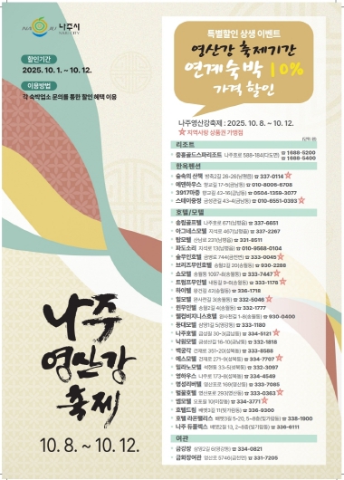 [세계로컬타임즈] 전라남도 나주시가 오는 10월 8일부터 12일까지 열리는 ‘2025 나주영산강축제’ 기간 동안 지역 숙박업소와 함께하는 숙박 특별할인 상생 이벤트를 마련했다.
