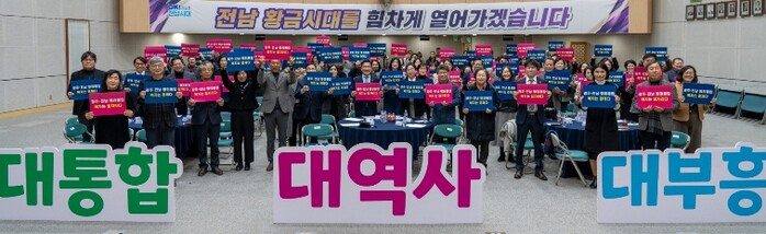 이날 행사에는 강위원 전남도 경제부지사를 비롯해 광주·전남사회복지사협회 회장단과 회원 등 사회복지인 150여 명이 참석했다. 행정통합 추진 경과 브리핑과 의견수렴, 공동선언문 낭독, 퍼포먼스, 기념촬영 순으로 진행됐다.