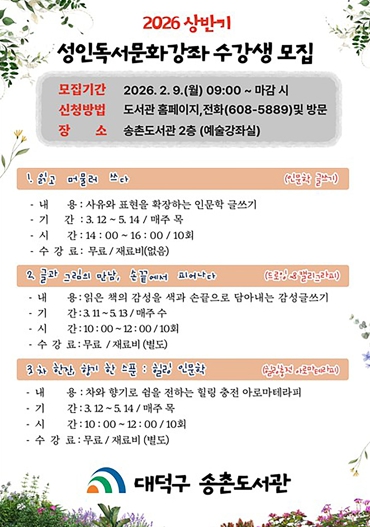 강좌 접수는 9일 오전 9시부터 정원 마감 시까지 진행되며, 신청은 대덕구도서관 홈페이지와 전화 또는 방문 접수로 가능하다.