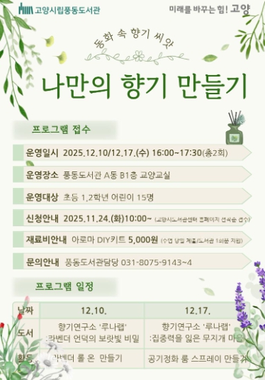 이번 프로그램은 오는 12월 10일과 17일, 오후 4시부터 5시 30분까지 풍동도서관 A동 지하 1층 교양교실에서 진행된다.