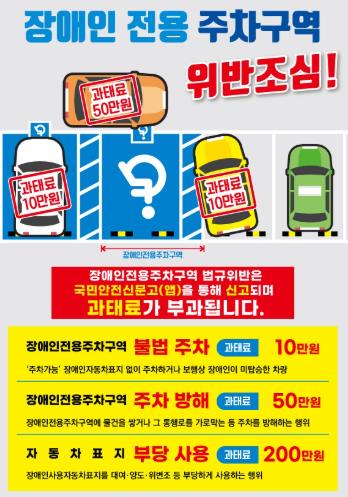 위반 유형별 과태료 기준은 ▲불법주차 10만 원(장애인주차표지 미발급 차량 주차, 전용구역 침범, 표지 미부착 등) ▲주차방해 50만 원(전용주차구역 내 또는 주변에 물건 적치, 2면 이상 이용 방해 행위) ▲장애인주차표지 부당 사용 200만 원(표지 위·변조, 대여 등)이다.