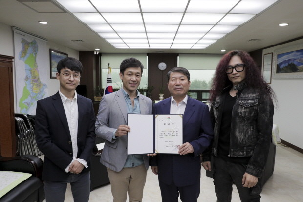 | ▲ 백경현 구리시장(오른쪽 두번째)이 10일 인디밴드 알에스프레소(RSpresso)를 문화예술분야 홍보대사로 위촉하고 기념 촬영을 하고 있다.<사진제공=구리시청> |