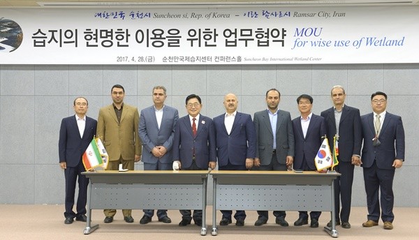| ▲ 28일 순천시와 이란 람사르시 관계자들이 습지 보전과 이용을 위한 업무협약을 체결한 후 기념촬영하고 있다.<사진제공=순천시청> |