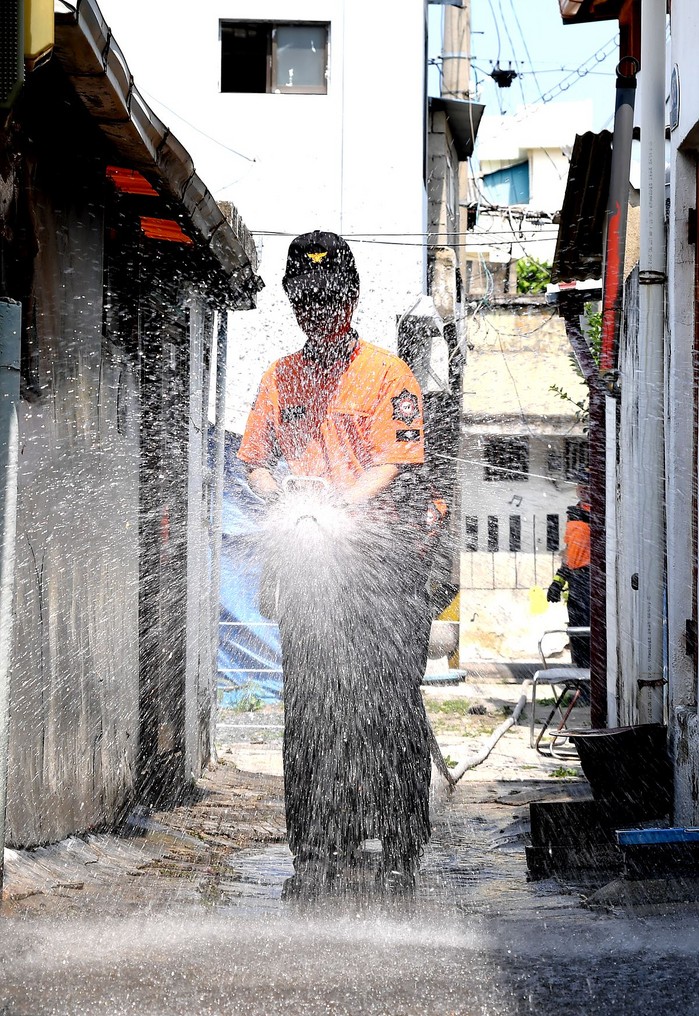 이날 소방차량 살수작업은 은행동 목척길 대로변에서 시작해 쪽방촌 골목길에 하루 1~2회, 총 6톤의 물을 뿌리며 열기를 낮추며 냉방시설 없이 폭염을 견디는 주민의 더위해소에 총력을 기울이고 있다.