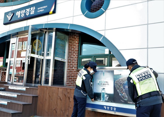 | ▲관내 파출소에 해양오염예방포스터 부착 장면(사진=목포해경) |