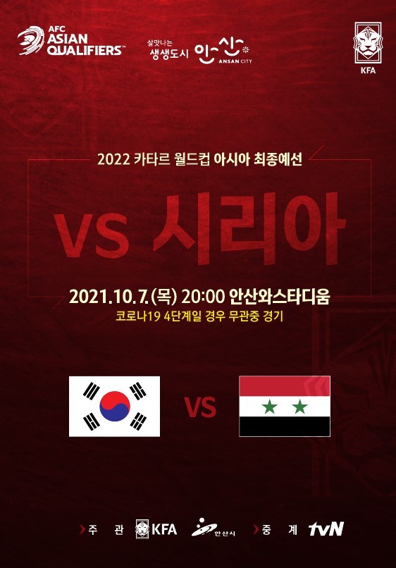 5일 안산시에 따르면 이번 아시아 최종예선 A조 3차전 상대는 FIFA 랭킹 81위인 시리아로, 태극전사들이 상대의 수비를 뚫고 다득점을 만들어 낼 수 있느냐가 관건이 될 것이라는 전망이다.