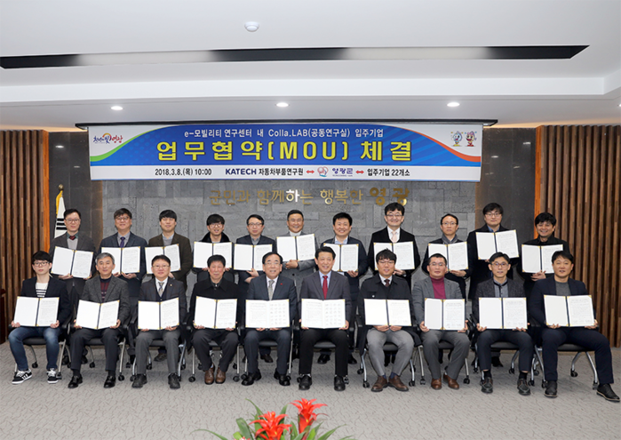 군은 8일 군청 소회의실에서 김준성 군수와 김병수 자동차부품연구원장, 22개 기업 대표와 임직원 등이 참석한 가운데 업무협약(MOU)을 체결했다고 밝혔다.