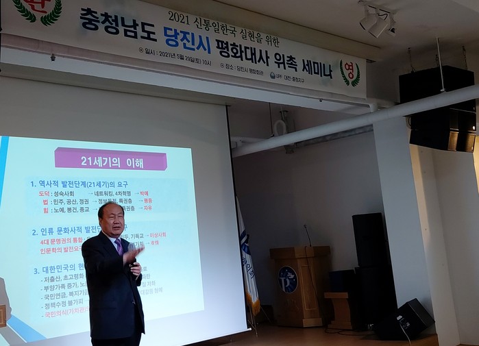[세계로컬타임즈 홍윤표 조사위원] 당진시평화대사협의회는 29일 오전 당진평화회관 대회의실에서 2021 신통일한국 실현을 위한 평화대사 위촉 세미나를 진행했다.