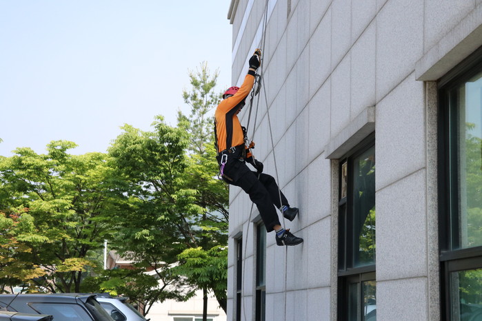 | ▲남양주소방서 공무원이 22일 소방서 건물에서 암벽타기 훈련을 실시하고 있다.<사진제공=남양주소방서> |