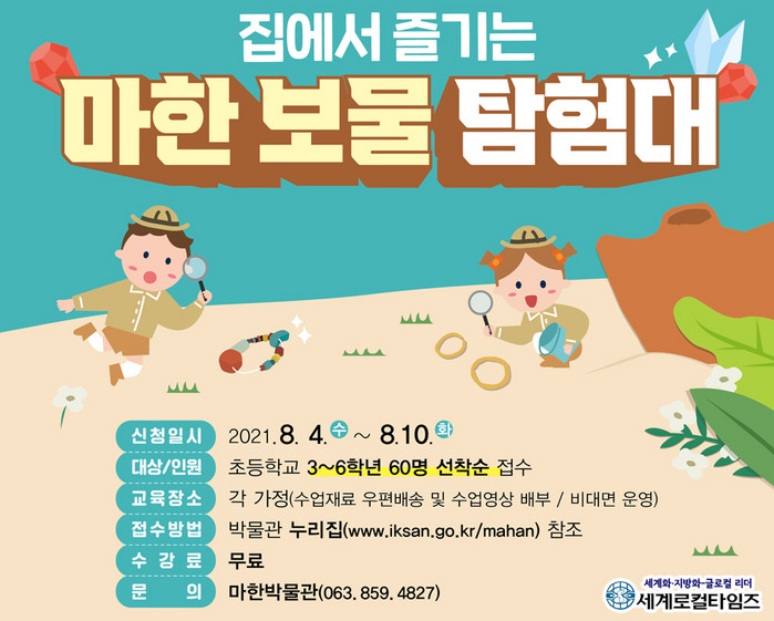 [세계로컬타임즈 조주연 기자] 전북 익산 마한박물관에서 초등학교 3학년 이상 학생 60명을 대상으로 비대면 ‘여름방학 어린이 박물관학교’가 운영된다.