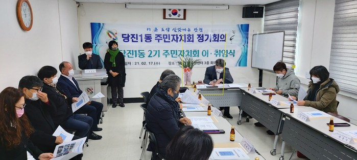| ▲당진1동 주민자치회는 17일 당진1동 주민자치센터 회의실에서 제2기 주민자치회장 이·취임식을 진행하고 있다. |