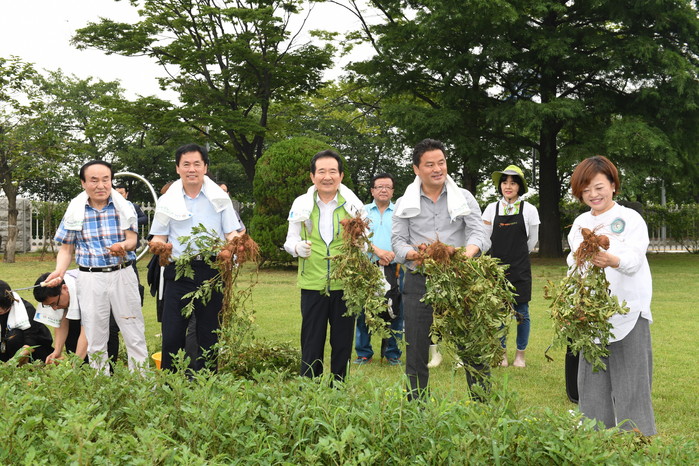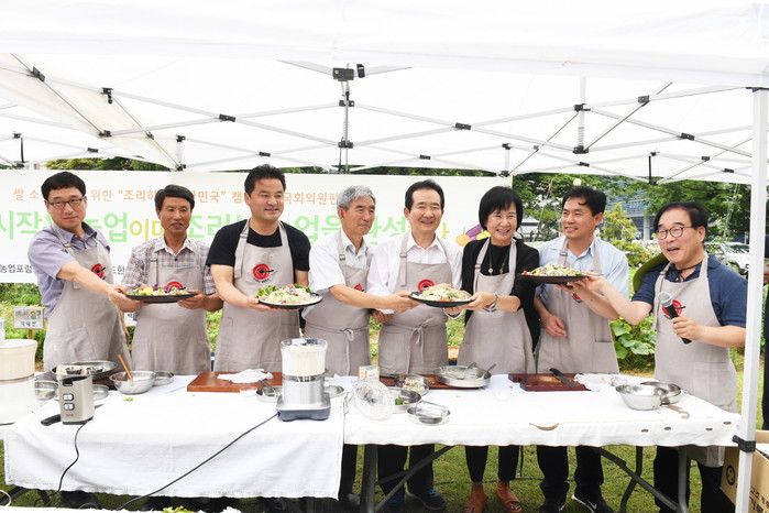 | ▲ 정세균 국회의장(오른쪽 네번째)이 18일 국회생생텃밭에서 열린 '탱글탱글 감자캐기 행사'에 참석해 조리한 감자샐러드를 선보이고 있다.<사진제공=국회> |