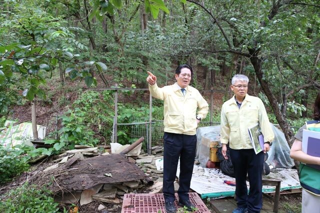 | ▲최대호 안양시장이 산사태 취약지역을 방문해 현장 점검를 하고 있다.(사진=안양시 제공) |
