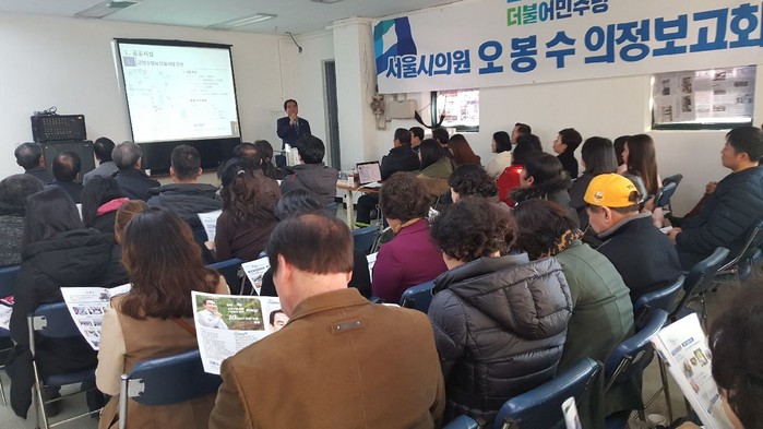 | ▲ 오봉수 서울시의원이 지난 25일 서울시 금천구 독산동에 위치한 자신의 사무실에서 의정보고회를 개최하고 있다. |
