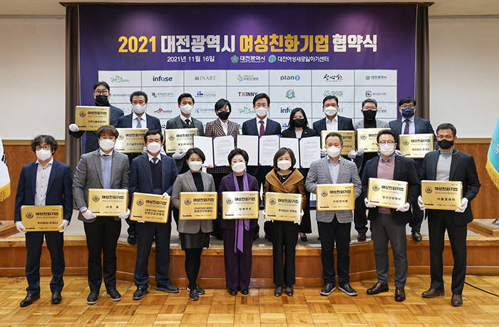 2021년 여성친화기업으로 △유니코스(주) △보강한방병원 △(의)브레인요양병원 △(주)성경식품 △로쏘(주)성심당 △신기술(주) △실버랜드 △(의)유성한가족병원 △이루다플래닛(주) △(주)인아트 △(주)인포스 △(주)트위니 △(주)포벨 △(주)플랜아이 △특허법인 플러스 등 총 15개 기업이 선정됐다.