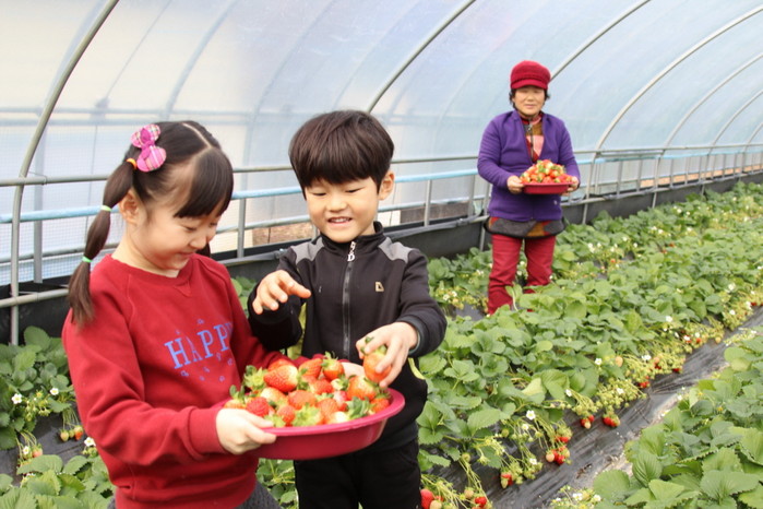[세계로컬신문 이평래 기자] 입춘이 지나 봄향기 그윽한 전남 보성군 벌교읍 척령리 원동마을 딸기 하우스에서 아이들이 탐스럽게 익은 딸기를 수확하며 웃음꽃을 피우고 있다. 이곳 딸기밭은 친환경 재배로 당도가 높고 과육이 단단한 딸기를 생산해 농산물 시장으로 인기리에 판매되고 있다.<사진제공=보성군청>
