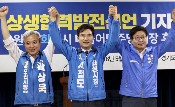 | ▲ 더불어민주당 오산시(곽상욱)·화성시(서철모)·수원시(염태영) 후보가 28일 공동 기자회견을 열고 상생협력 발전을 선언하고 있다. |