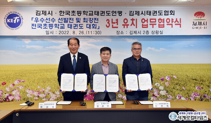 [세계로컬타임즈 조주연 기자] 전북 김제시와 한국초등학교태권도연맹, 김제시태권도협회가 올해부터 3년 연속으로 ‘우수선수 및 최강전 전국초등학교 태권도대회’를 김제에서 개최키로 협약했다.