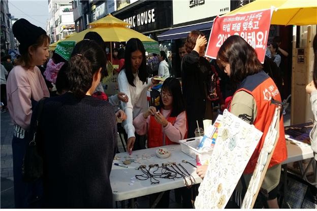 | ▲ 동해시 청소년수련관 도자기동아리 ‘토토’ 회원들이 원주시에서 열린 강원도 청소년활동 대축제에 참가해 도자기 타일과 목걸이를 선보이고 있다.<사진제공=동해시청> |