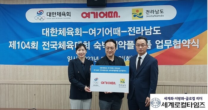 [세계로컬타임즈 김명진 기자] 전남도와 대한체육회가 오는 10월 전국체전을 위해 23일 여행 플랫폼인 ‘여기어때’와 업무협약을 했다.