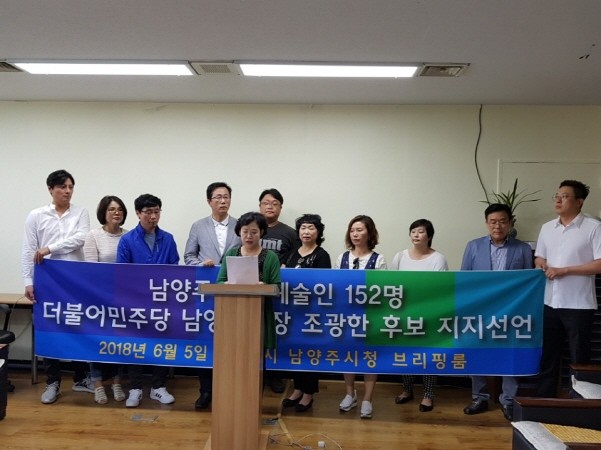 남양주시청 브리핑룸에서 진행한 이날 지지선언에 따르면 "문화예술인 152명은 문화예술을 우선으로 하는 조광한후보의 공약에서 무엇보다 구체적인 정책과 실천방안을 제시하는 것에 신뢰를 보낸다"며 지지 이유를 밝혔다.