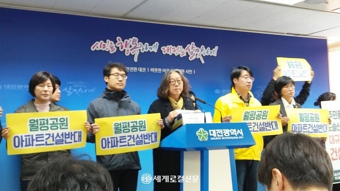 | ▲ 26일 오후 월평공원 주민대책위위원회 등 개발안 반대측은 시청 브리핑룸에서 긴급 기자브리핑 통해 월평공원 개발안 관련 제3차 대전시 도시공원위원회 결과 발표에 반발하고 있다.<사진= 오영균 기자> |