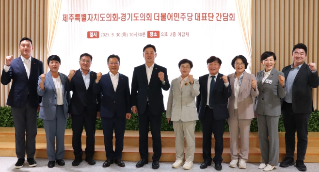 제주도의회에서 송창권 대표(외도·이호·도두동), 김기환 부대표(이도2동갑), 하성용 부대표(안덕면), 강성의 정책위원장(화북동), 홍인숙 대변인(아라동갑) 등이, 경기도의회에서는 최종현 대표의원을 비롯해 장한별 총괄수석부대표(수원4), 신미숙 기획수석(화성4), 이채명 소통·협력수석(안양6), 남종섭 전 대표의원(용인3)이 간담회에 함께했다.
