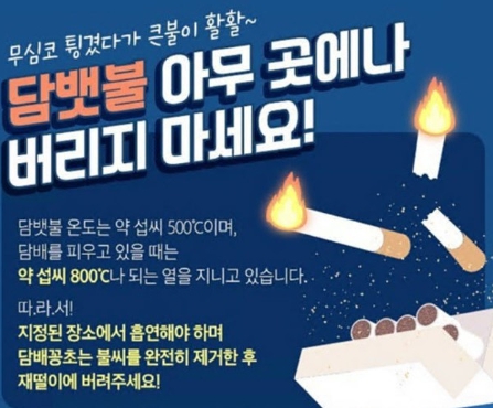 주요 안전 수칙은 ▲지정된 장소에서 흡연하기 ▲흡연 장소에는 재떨이를 비치하기 ▲꽁초는 물을 적시거나 불씨를 완전히 꺼서 재떨이에 버리기 ▲흡연 후 꽁초는 절대 무단 투기하지 않기 등이다.