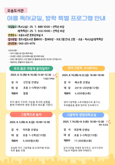 각 도서관의 특화 주제를 반영한 강좌도 열린다. △오송(생명과학) ‘우리 몸은 어떻게 움직일까?’ △서원(인문학) ‘파랑새를 찾아라’ △신율봉(영어) ‘영어그림책 퐁당 빠져보기’ △강내(생태) ‘폐북, 다시 태어나요’ △옥산(농업) ‘꼬마 농부의 그림책 놀이’ △가로수(음악) ‘영어야, 놀자! 동요랑 동화랑’ 등이다.