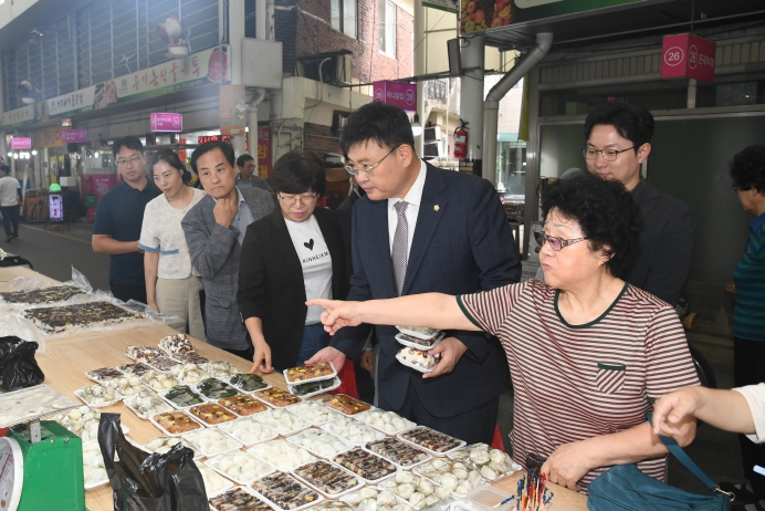 이번 행사는 고물가와 경기 침체로 어려움을 겪는 전통시장에 활력을 불어넣고 지역경제 활성화를 도모하기 위해 마련됐다. 먼저 의원과 직원 20여 명은 북부시장 상인회와 간담회를 갖고 현장의 애로사항을 청취하며 활성화 방안을 논의했다.