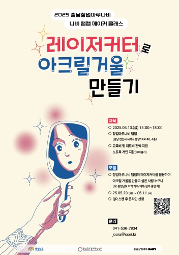 레이저커터 장비를 활용해 아크릴 거울을 제작을 해보고 싶은 충청남도 지역 거주·재학·근무 중인자라면 누구나 참여 가능하며, 참가신청은 6월 11일까지 온라인으로 신청할 수 있다.
