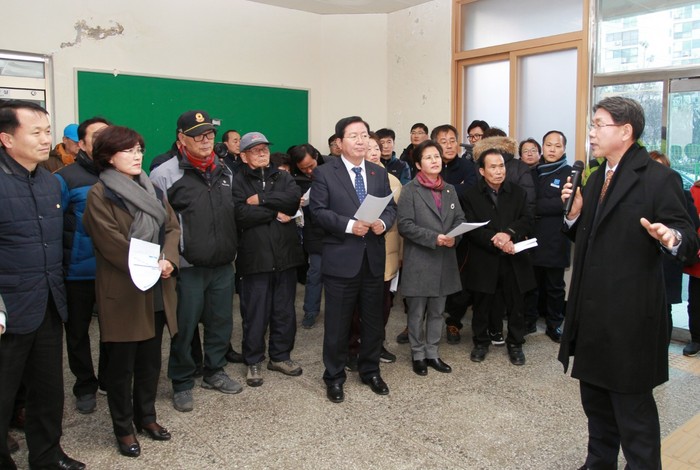 | ▲ 이재관 대전시장 권한대행(오른쪽 첫번째)이 13일 가수원역 역사에서 장종태 서구청장을 비롯한 시민들에게 호남선 고속화사업 추진상황을 설명하고 있다. |