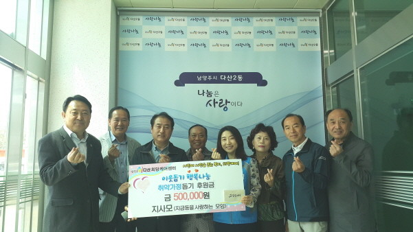[세계로컬신문 고성철 기자] 경기도 남양주시 다산2동 지사모(지금동사랑모임, 회장 이연환)은 26일 '가정의 달' 5월을 앞두고 소외된 이웃을 위한 후원금 50만원을 다산2동 복지넷(위원장 김민수)과 다산희망케어센터(센터장 신영미)에 전달했다.