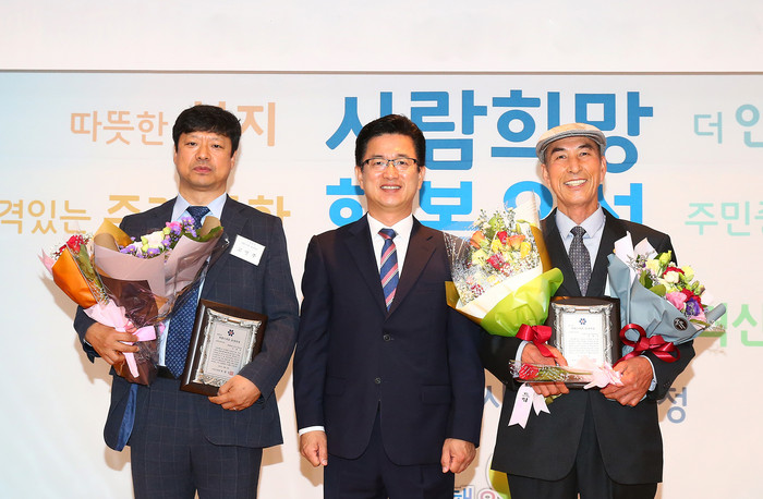 | ▲12일 대전 유성구청 대강당에서 ‘자랑스러운 유성인’으로 뽑힌 고영주(왼쪽), 한명석(오른쪽)씨가 허태정 구청장과 기념촬영하고 있다.<사진제공=유성구청> |