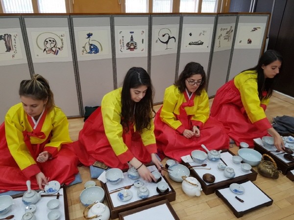 | ▲ 지난 24일 경북대학교에 재학중인 외국인학생들이 한복을 입고 다도체험을 하고 있다.<사진제공=대구시 북구청> |