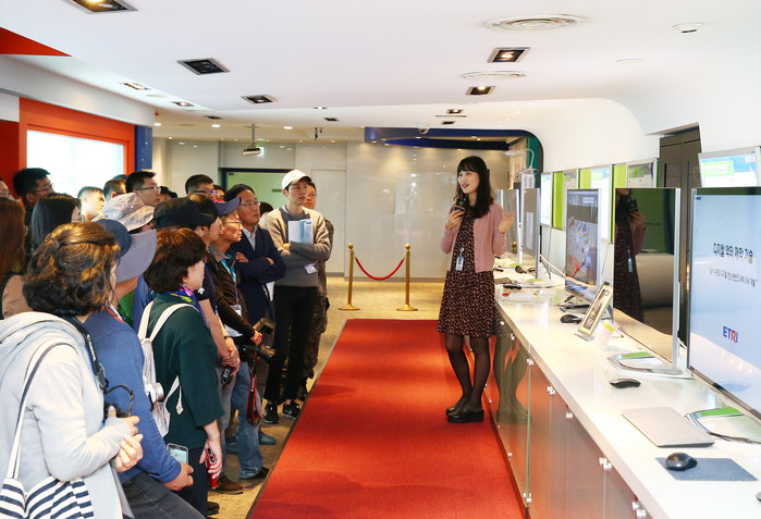| ▲17일 유성구 홍보 팸투어에 참여한 서울지역 파워블로거 25명이 한국전자통신연구원을 방문해 관계자의 설명을 듣고 있다 |
