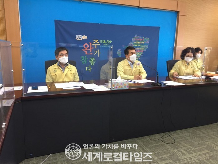 [세계로컬타임즈 조주연 기자] 박성일 전북 완주군수가 6일 코로나19 관련 긴급대책회의를 열고 “지역 감염 사례가 나오고 있어 전 직원들이 긴장감을 늦추지 말고 방역망을 강화해 나가야 할 것”이라고 말했다.
