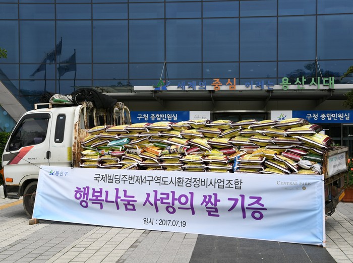 국제빌딩주변제4구역 도시환경정비사업 조합에서 관내 저소득 주민을 위해 용산복지재단에 백미 2470kg을 기탁한 것이다.