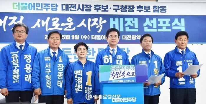 한편 이날 6·13 지방선거에 출마하는 허태정 더불어주당 대전시장 후보를 비롯해 박용갑·장종태·정용래·황인호·박정현 구청장 후보자 등 30여 명이 참석해 '대전, 새로운 시작' 비전 공동선언문을 발표했다.