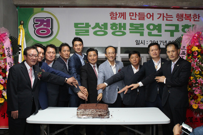 | ▲ 지난 16일 대구시 달성군 다사읍에서 열린 '달성행복연구회' 출범식에서 참석자들이 축하떡을 자르고 있다. |