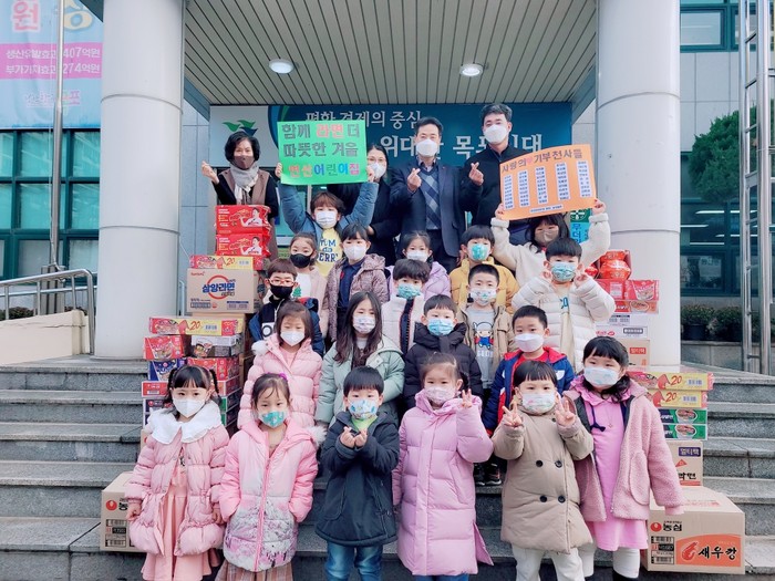 원산동에서는 지난 15일 연산어린이집(원장 고경화)이 원생 20여명과 함께 ‘함께라면 더 따뜻한 겨울’이라는 슬로건으로 어린이들이 각 가정에서 십시일반 모은 라면 20박스(50만원 상당)를 기부했다.